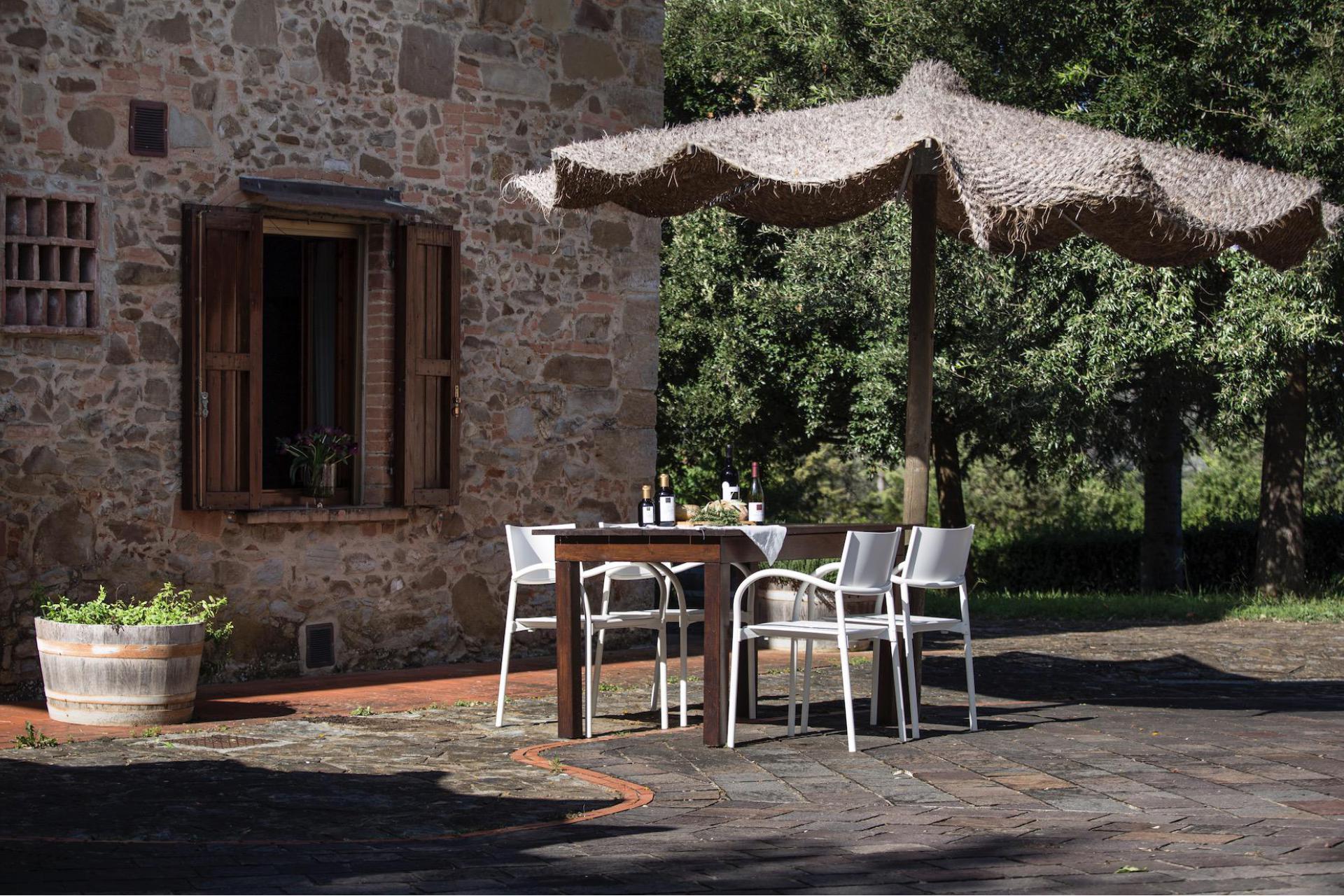 Der Ferienhof liegt auf einem Hügel und ist über eine kleine, gut ausgebaute Straße zu erreichen, die normalerweise nur von den Gästen des Bauernhofs und einigen wenigen anderen genutzt wird. Sobald Sie ankommen, finden Sie ein sorgfältig restauriertes Bauernhaus aus dem 17. Jahrhundert vor, das inmitten von mehr als 150 Hektar Ackerland steht, von denen 20 Hektar Weinberge sind und es 3000 Olivenbäume gibt. Der Hof produziert ausgezeichneten Wein, Bio-Öl und erzeugt eine kleine Menge Honig. Sie können diese Produkte im Weinkeller probieren und kaufen.