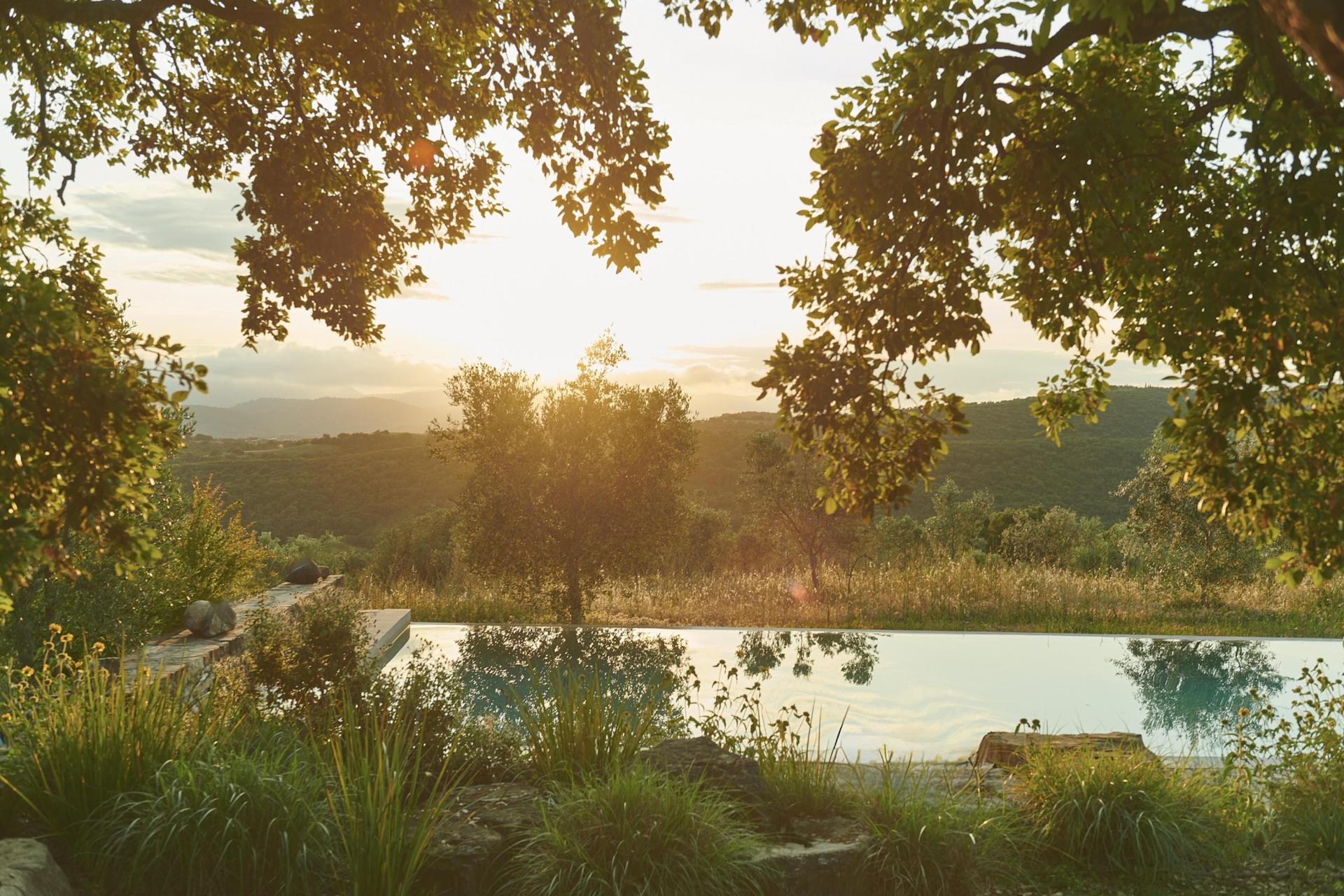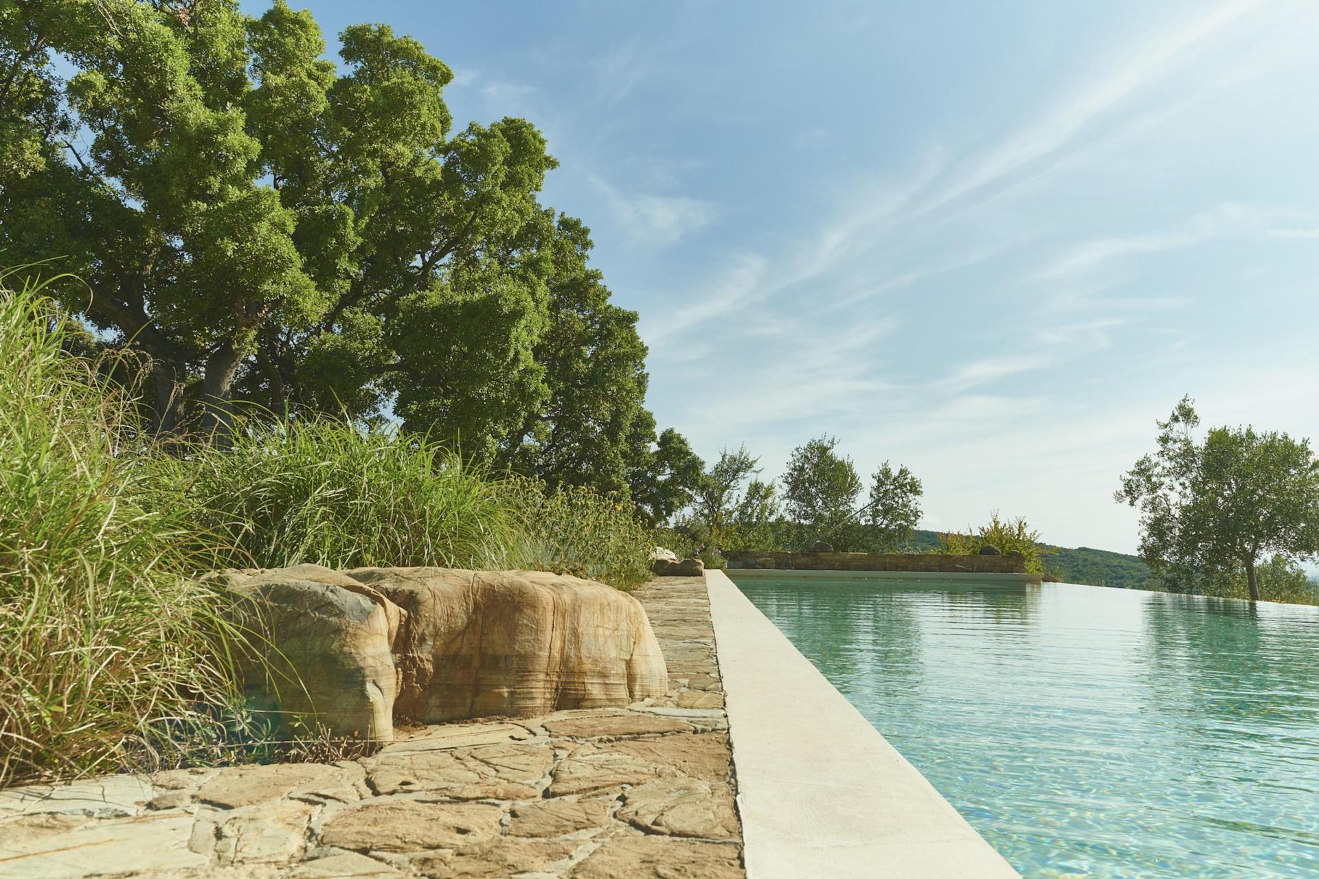 Das Herzstück ist der wunderschöne Infinitypool, der scheinbar direkt in das Tal übergeht. Von Ihrer Sonnenliege aus genießen Sie den Blick über die Hügel bis hin zum Meer, während uralte Korkeichen natürlichen Schatten spenden. Dank des milden Salzwasserreinigungssystems gibt es keinen typischen Chlorgeruch und das Wasser fühlt sich angenehm weich auf der Haut an.