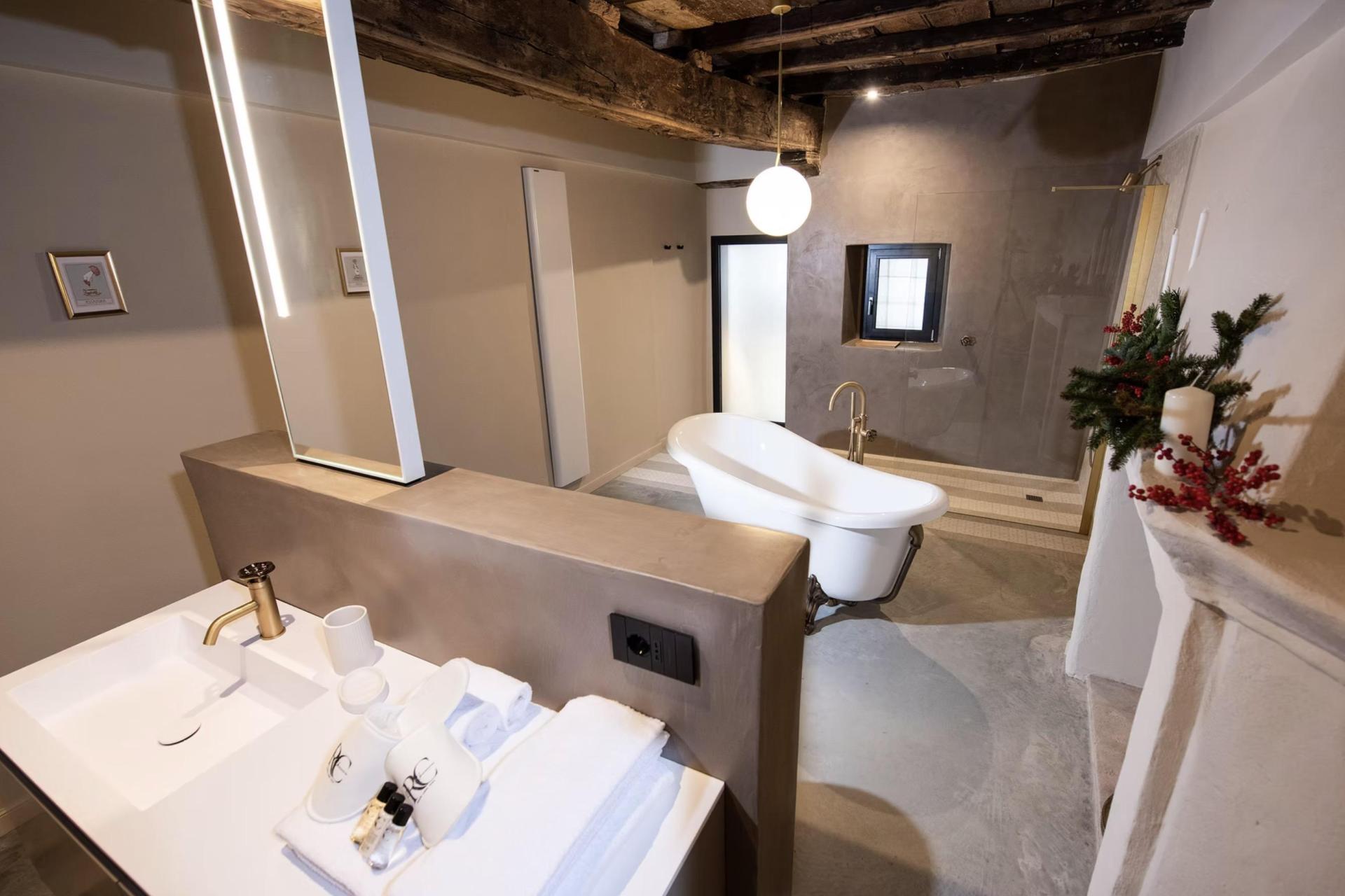 Im charakteristischen Innenhof steht ein alter Olivenbaum als zentrales und symbolisches Herzstück des Anwesens. Bequeme Sessel und Sonnenschirme laden dazu ein, hier am Abend mit einem guten Glas Wein zu verweilen. Für Gäste, die die Umgebung gerne aktiv erkunden möchten, stehen E-Bikes zur Miete bereit. Außerdem gibt es eine Ladestation für Elektroautos.