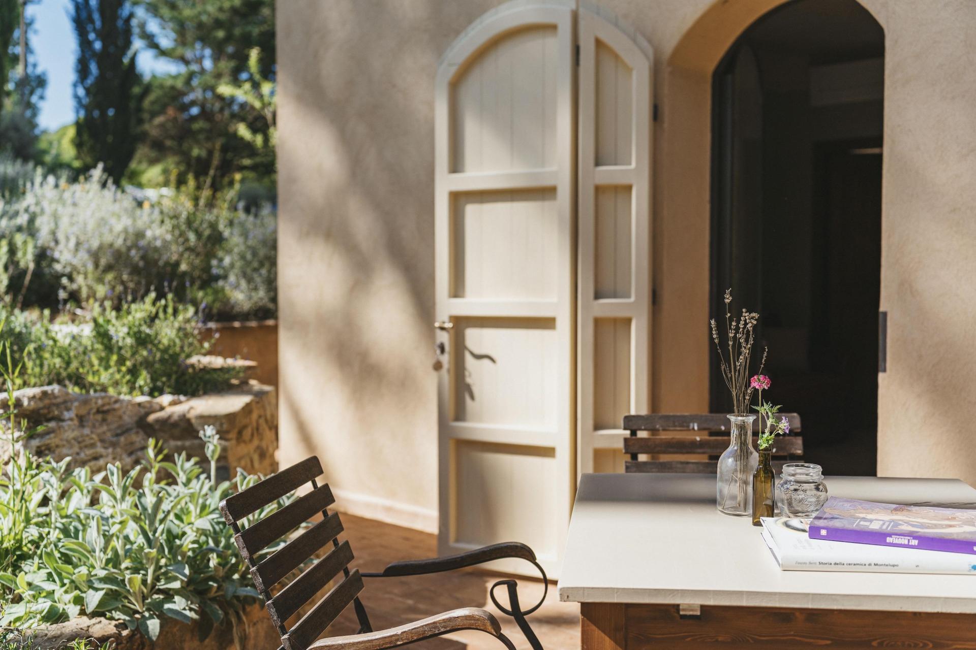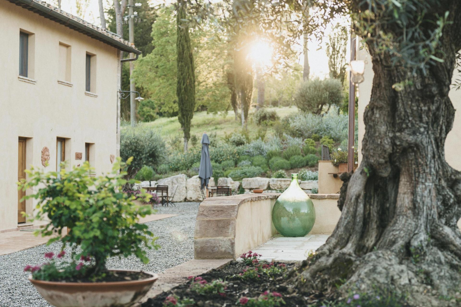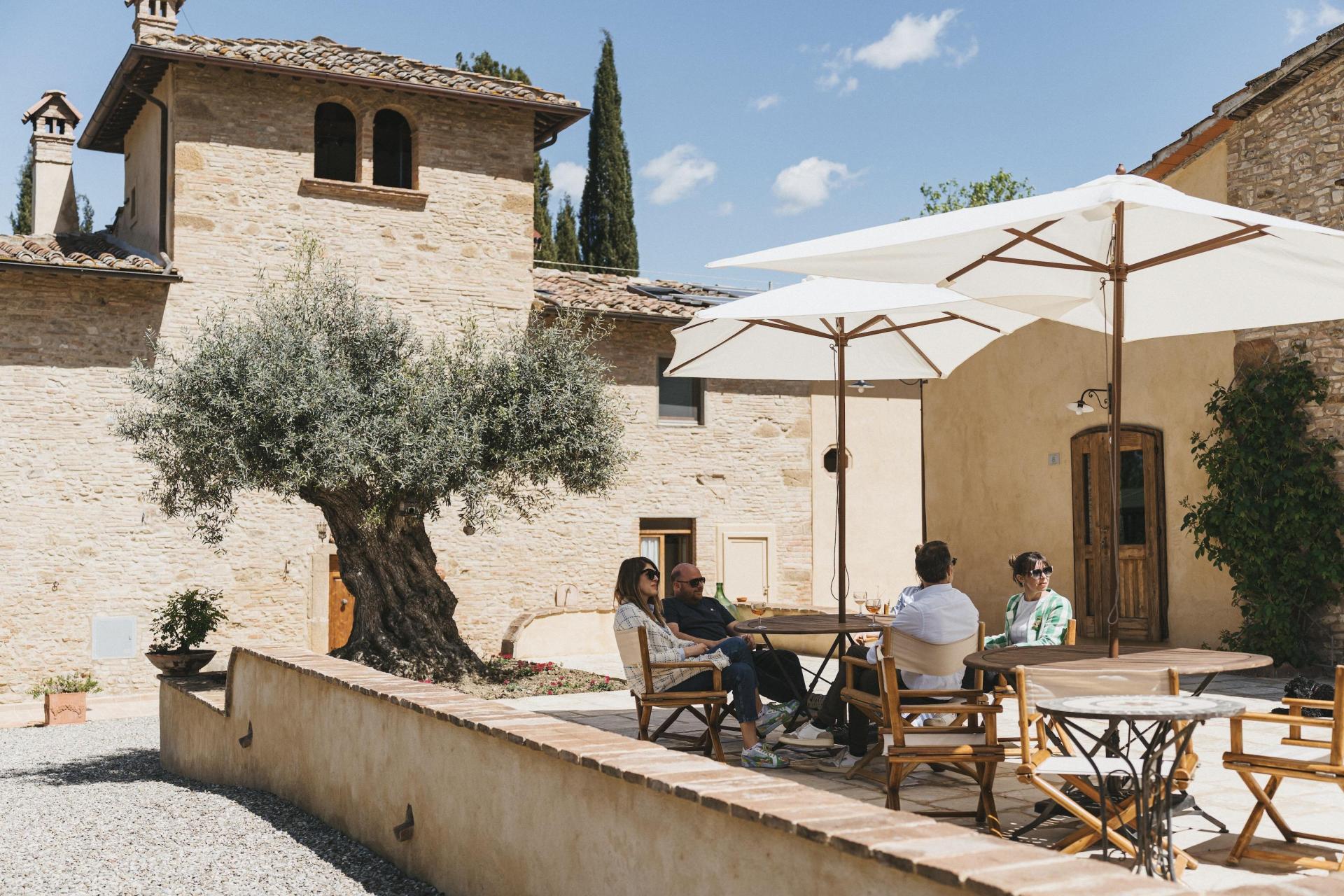 Die Gebäude gruppieren sich um einen offenen Innenhof, der das Herz des Borgos bildet und sich ganz selbstverständlich als Treffpunkt anbietet. Von hier aus erstreckt sich der Garten mit verschiedenen ruhigen Ecken und Sitzgelegenheiten, in denen jeder seinen eigenen Platz finden kann.