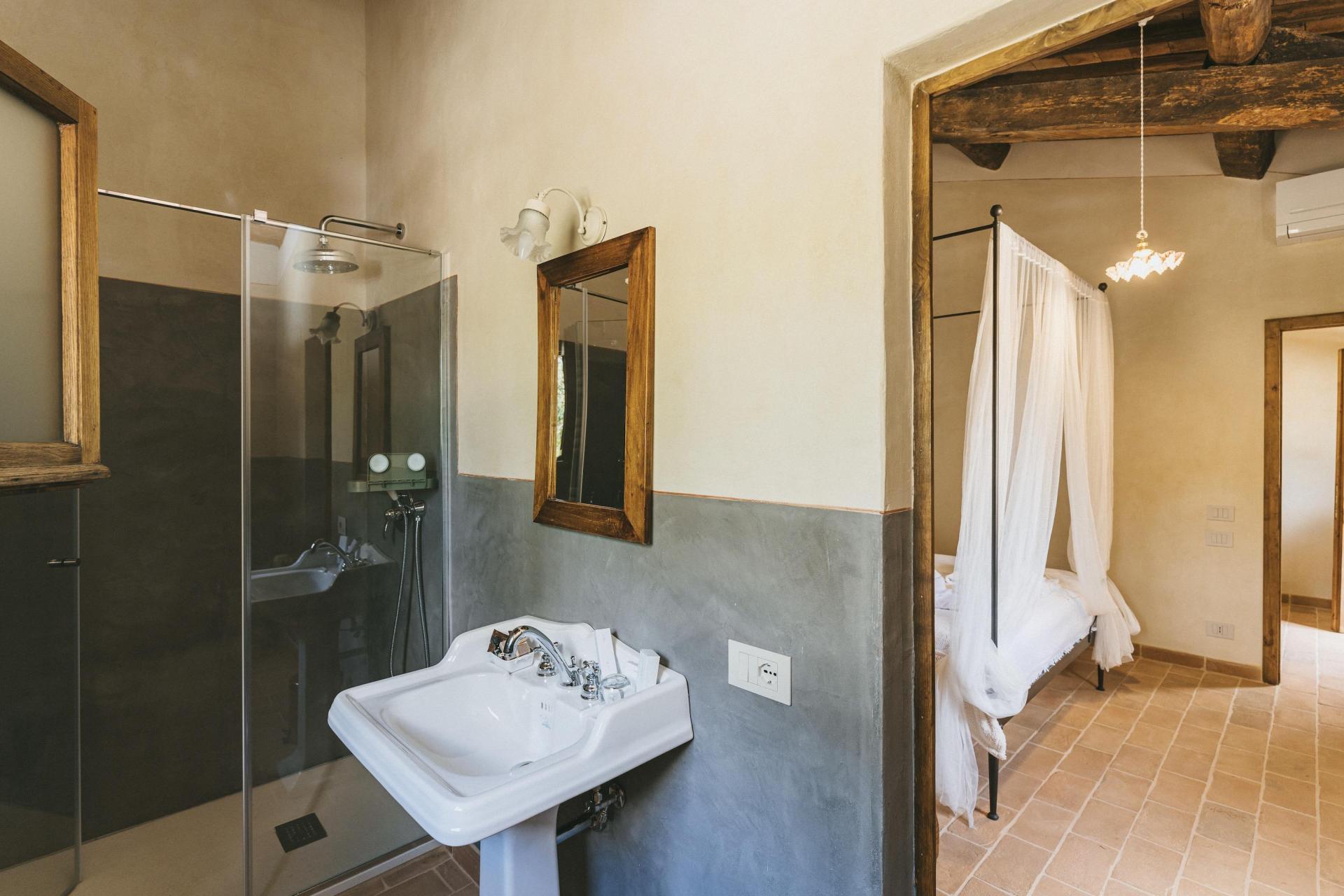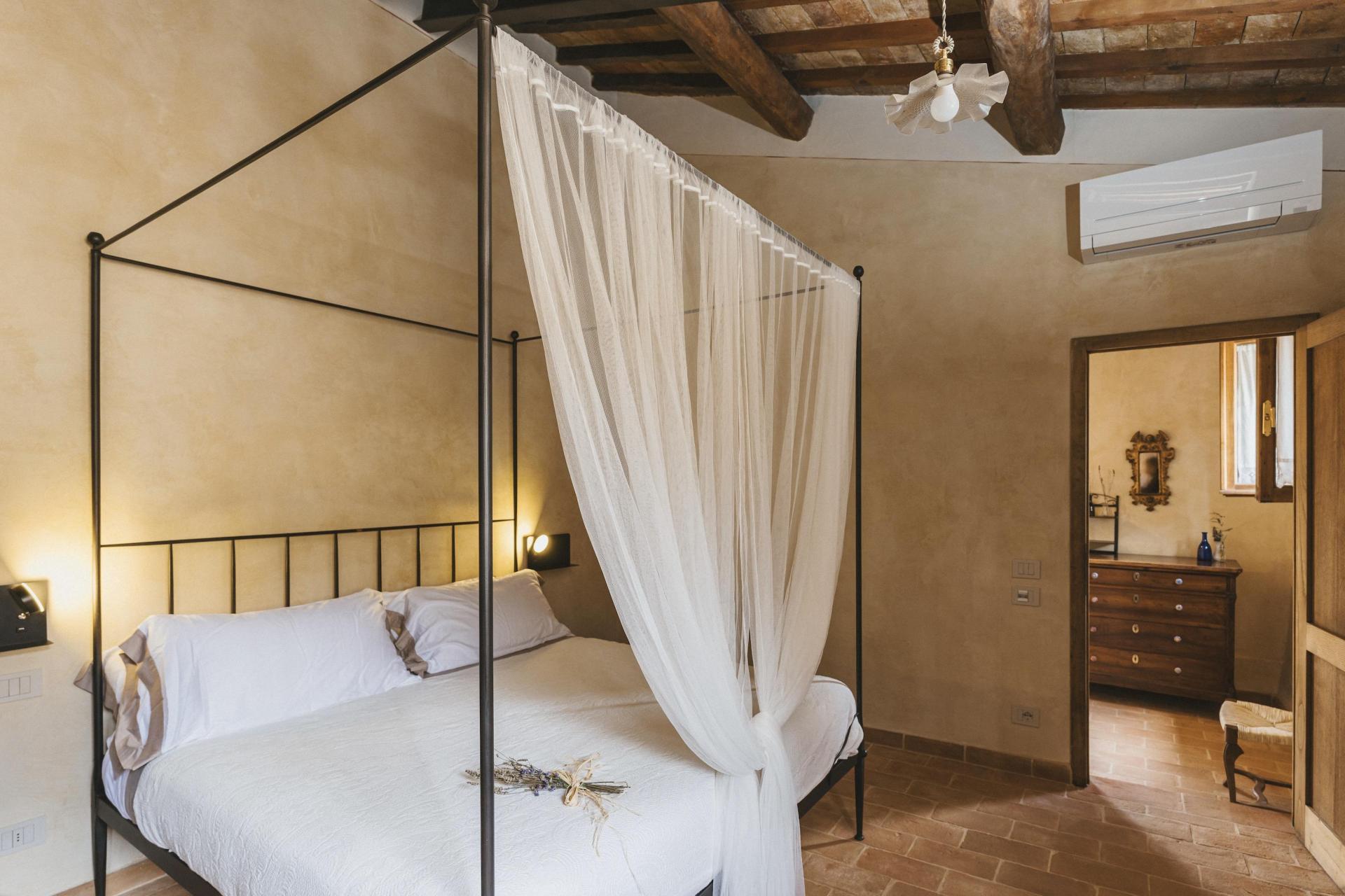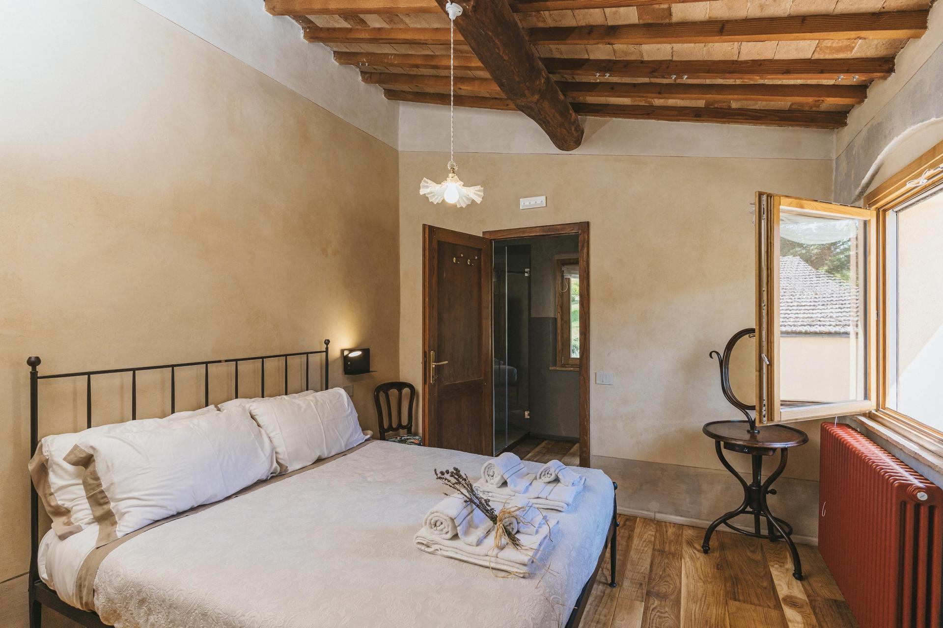 Das Agriturismo verfügt über zwölf Zimmer, verteilt auf mehrere Gebäude innerhalb des Borgos. Es handelt sich nicht um standardisierte Zimmer – jedes hat seinen eigenen Grundriss und Charakter. Natürliche Materialien und eine ruhige, zurückhaltende Einrichtung unterstreichen überall die besondere Atmosphäre des Ortes.