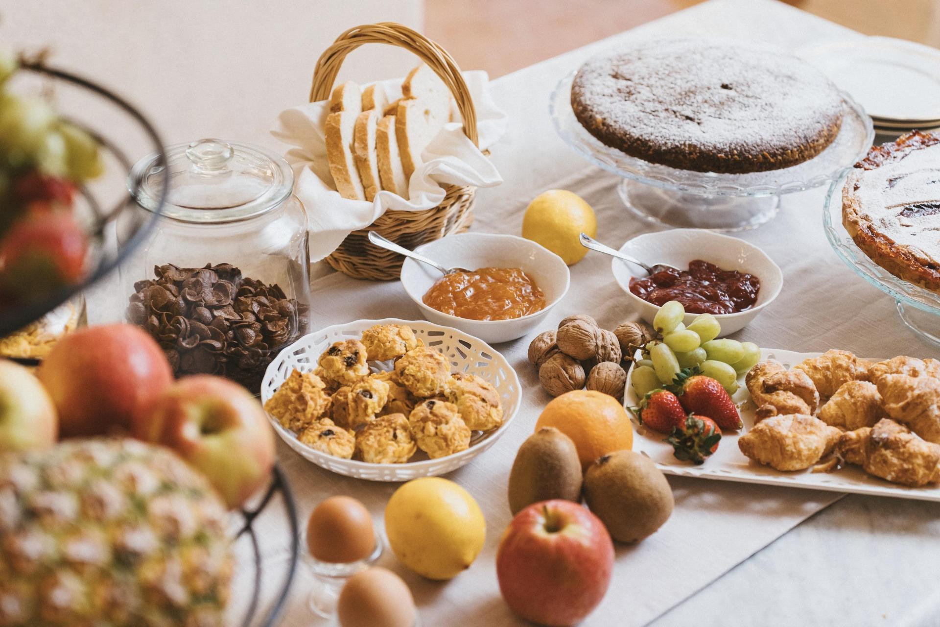 Das Frühstück ist reichhaltig und saisonal, mit einer Auswahl an süßen und herzhaften Produkten: frisches Obst, hausgemachte Kuchen und Kekse, Brot und Croissants, Käse und Wurst aus der Region sowie Eier von den eigenen Hühnern. Cappuccino und Espresso sind selbstverständlich erhältlich. In den wärmeren Monaten wird das Frühstück im Garten serviert.