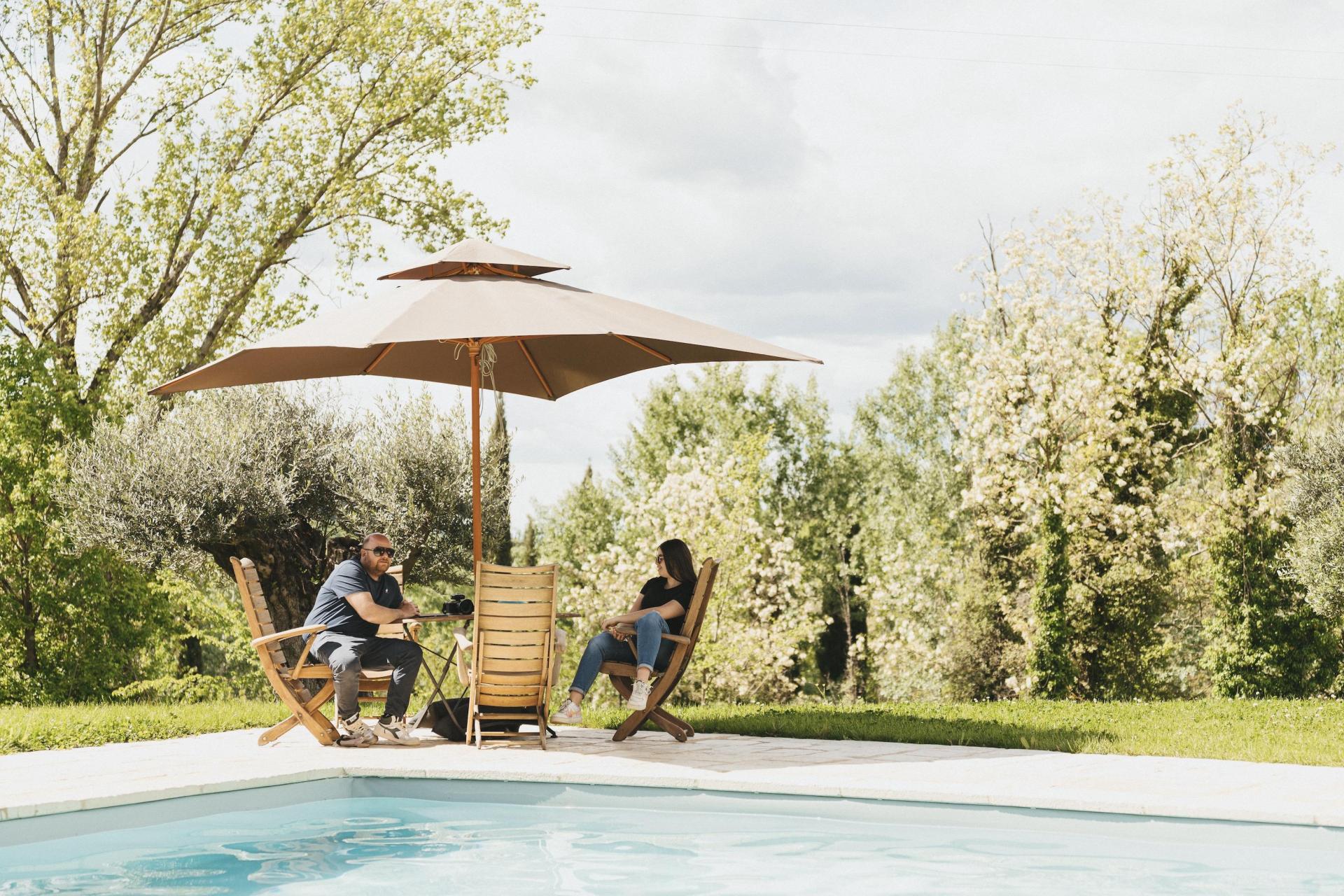 Der Pool liegt etwas höher auf dem Gelände und bietet einen weiten Blick über die Hügel und die umliegende Landschaft. Mit Liegen und schattigen Plätzen ist er ideal, um ein Buch zu lesen oder einfach einmal nichts zu tun.