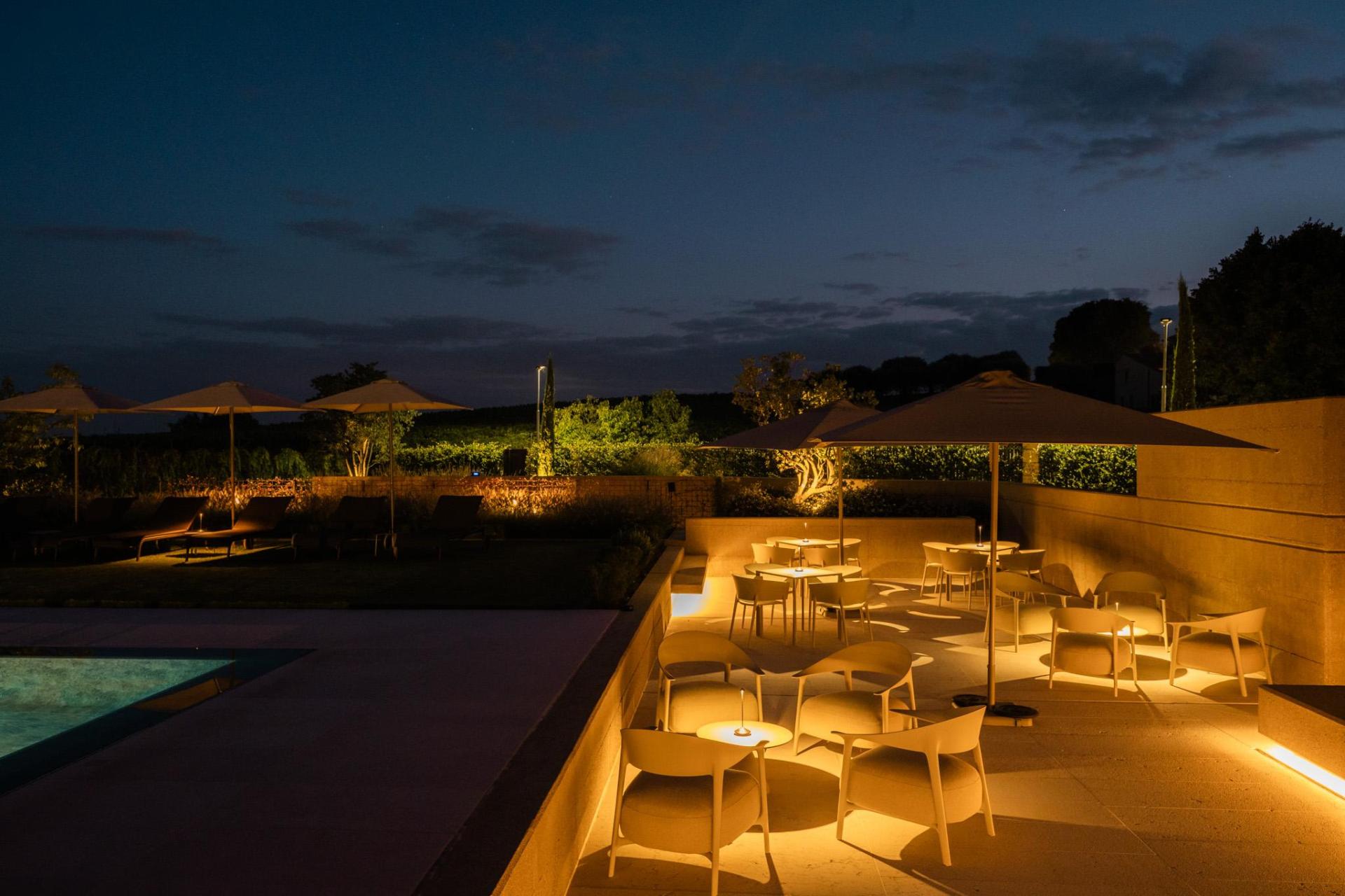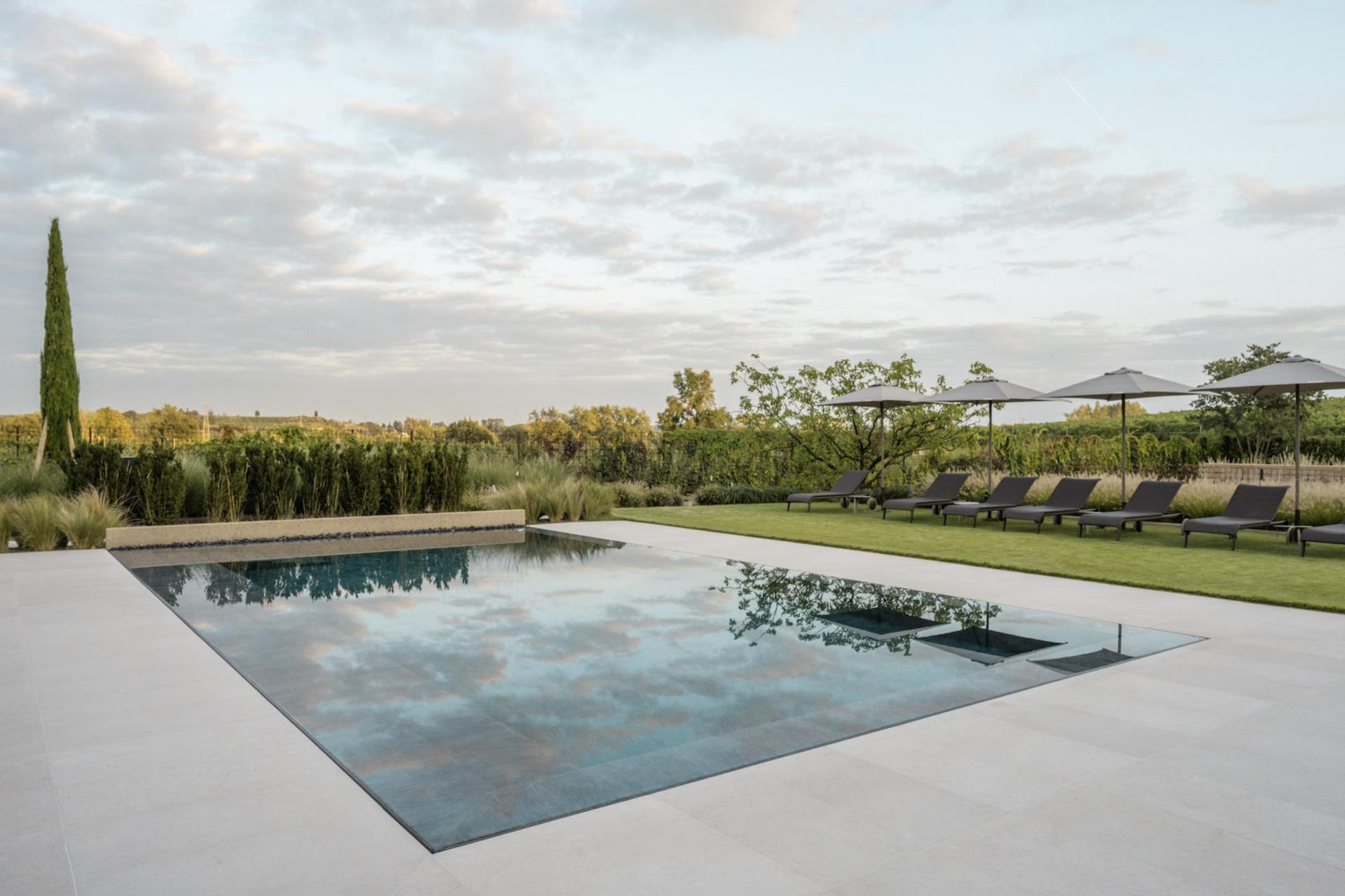 Der Garten und der Pool sind mit viel Aufmerksamkeit gestaltet und bieten verschiedene Plätze zum Entspannen – sowohl in der Sonne als auch im Schatten. Die Atmosphäre ist ruhig und angenehm, ohne Trubel, und man genießt einen weiten Blick über die umliegenden Felder.