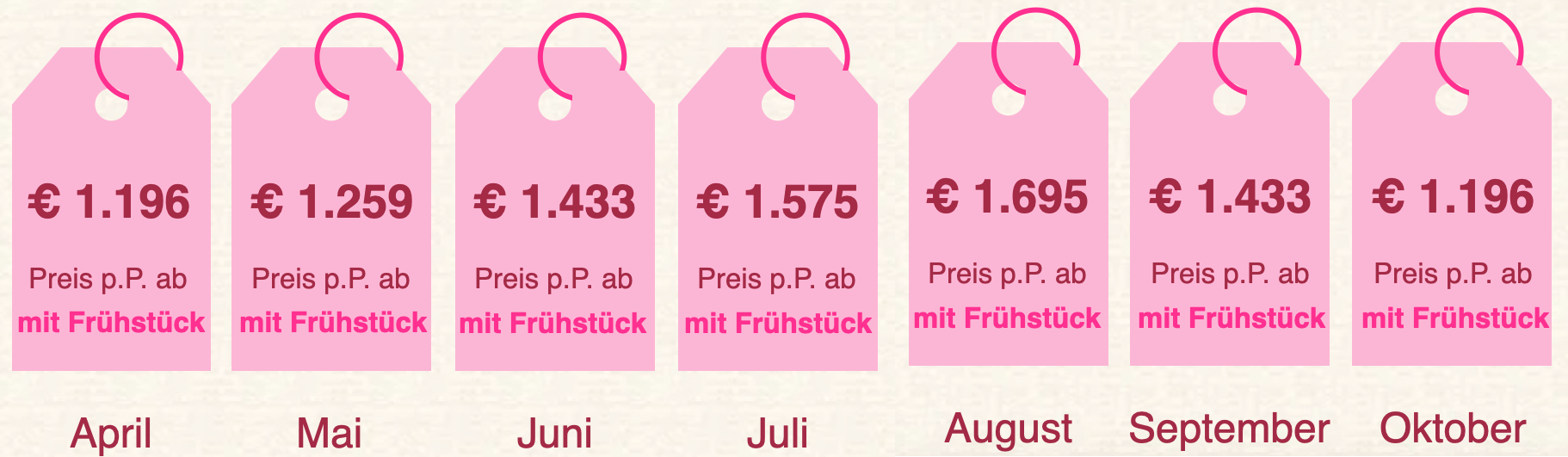 Startpreis p.P. für 14 Nächte, Unterkunft und Frühstück